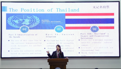 作为培养青年全球视野与实践能力的品牌活动,本次大赛严格遵循联合国议事流程。决赛现场,随着主席团完成“国家点名”,各“国家代表”手持国家牌应答,议题研讨正式开启。