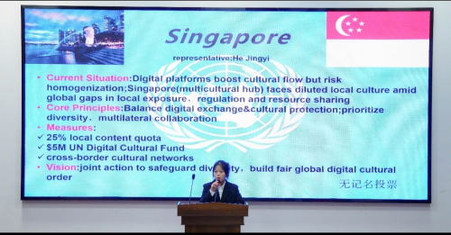 无记名投票环节成为赛事高潮。各“国家代表”围绕解决方案匿名表决,赞成与反对国家发表理由,整场质证环节中,选手们精准诠释所代表国家立场,更在“求同存异”中展现青年对全球文化治理的责任担当。