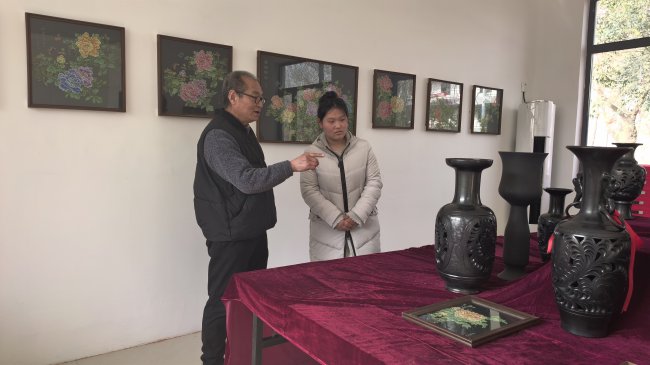 图为实践队员向非遗传承人王保祥学习黑陶历史文化。曲阜师范大学袁甜珂供图