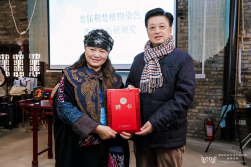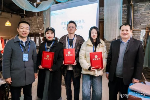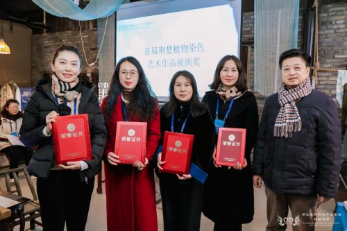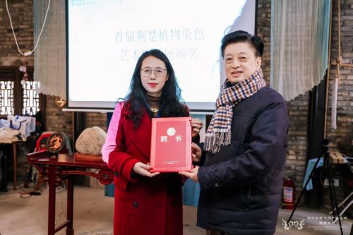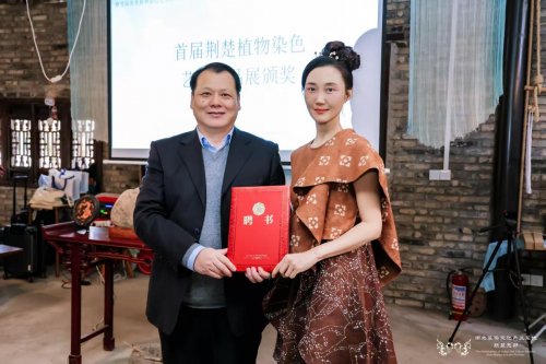 作为本届大会的亮点,“首届荆楚植物染色艺术作品展”共征集来自16家单位、66位作者的229件作品,涵盖服饰、家居、艺术装置等多类别。现场对评选出的一、二、三等奖及入围奖作者进行了表彰,湖北中华文化促进会常务副主席肖安民向首届荆楚植物染色艺术作品展一等奖作者颁发荣誉证书,联盟孙传明主席和石炜副主席向作品展二等奖作者颁发荣誉证书,展现了植物染艺术创作的蓬勃生态。