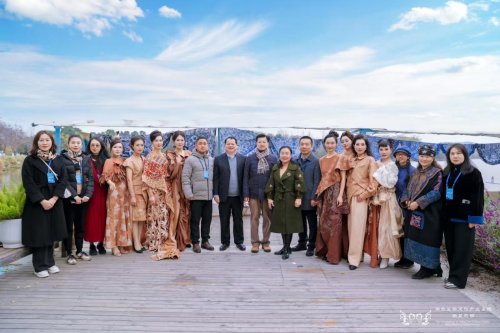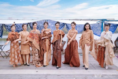 开幕式后,与会领导与代表共同移步湖畔秀场,观赏了由武汉纺织大学郭海燕副教授执导的“落雁望山植物染时尚大秀”。大秀将自然景观、无人机航拍与植物染服饰动态展示相结合,呈现出一场融传统技艺与时尚美学于一体的视觉盛宴。与会人员随后参观了艺术作品展,在草木色彩与创意织造中深入感受荆楚染韵的当代生命力。之后,武汉纺织大学王妮副教授举行了《创意手工印染服饰艺术教程》新书发布。