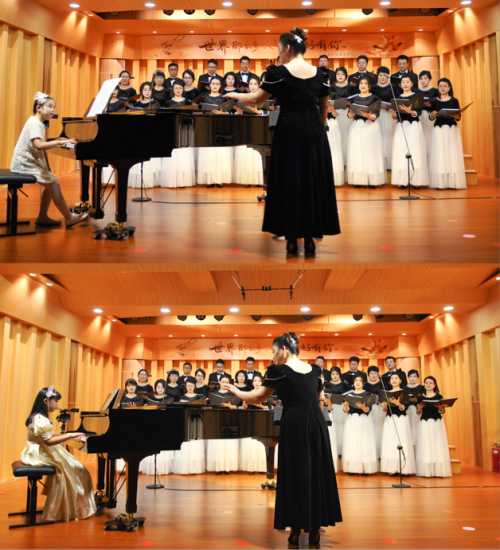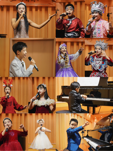 从开场后张楚晨《茶花开了》的清灵之声,到李梓涵《天使的眼睛》中的无瑕情感,孩子们用未经雕琢的真诚,触动了每位观众心中对纯粹美好的共鸣。肖碧竺演绎的《青花瓷》,则巧妙地完成了从集体抒情到个体古典美学表达的过渡。第二篇章中,张书察的《草原万里行》、石昕玉的《我爱我的大新疆》、李星岳的《苗山歌对歌》、孔岚珈的《苗山小咪彩》等小演员接连带来的民族风格作品,还有郭泽辰的《The Frog》、肖泽瑞的《墨西哥舞曲》、王华依的《快乐的小竹笛》、唐棣的《在森林里的圣诞树》(俄罗斯经典童谣)、杜雨诺的《一首快乐的歌》,不仅是才艺展示,更是活泼的“行走的美育课堂”。展现了艺术教育正在潜移默化地塑造着青少年的审美趣味与文化感知。直至尾声《夜空中最亮的星》全场共鸣,完整呈现了一场从“聆听美”,“感受美”到“表达美”,“分享美”的生动美育历程,体现了艺术教育润物无声却又力量磅礴的育人功能。