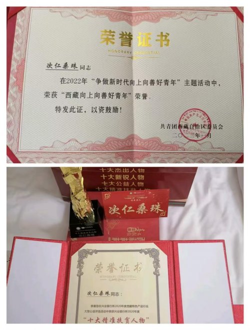 六、荣誉满载,激励前行凭借在创业富民、乡村振兴领域的突出贡献,他先后斩获第六届中国国际“互联网+大学生创新创业西藏民族大学金奖”、西藏自治区“十大精准扶贫人物”、教育部主办的大学生创业项目展览“一等奖”、西藏自治区“向上向善好青年”、杰出大学生创业者等多项荣誉。 面对荣誉,他始终保持谦逊低调,深知成绩的取得离不开党和政府的政策扶持、团队的并肩奋斗与乡亲们的信任支持。这些荣誉对他而言,既是肯定更是责任,激励着他在创业兴乡的道路上持续奋进。