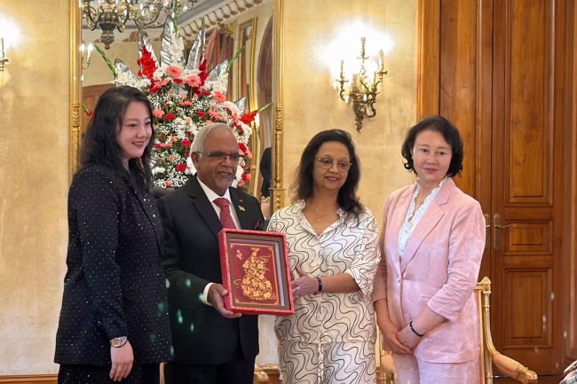 2月6日,在林海岩主席的带领下,王秀华、王丹一行再次受邀前往总统府,受到毛里求斯总统达朗戈库尔及夫人的亲切接见。总统特意在总统府后花园设下下午茶,与代表团一行促膝长谈、亲切交流,共话中毛两国民间友好往来的深厚渊源,共商中非人文交流合作的未来方向,随后双方合影留念,定格下中毛友谊的珍贵瞬间。会谈中,王丹代表艺术团向总统赠送了中国非遗剪纸《福禄》摆件,以中国传统非遗技艺传递新春的美好祝福,总统对中国非遗文化赞叹不已。