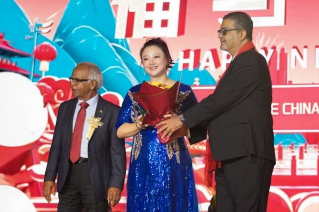 2月7日,备受瞩目的毛里求斯2026马年华侨华人春节联欢晚会在万众期待中盛大举行。现场座无虚席,观众人数超1600人,涵盖毛里求斯华侨华人、当地各界人士及国际友人;跨国演员阵容多达300余人,汇聚中国、法国、毛里求斯等多个国家的艺术家同台献艺,生动展现了不同文明交流互鉴、共生共荣的动人图景,传递出跨越山海的友好情谊。晚会以沉浸式舞台音乐剧为核心亮点,巧妙串联中华传统文化元素与时代特色,全景式展现中华五千年文明的深厚底蕴与独特魅力。王丹团长精心编排的《送别》《盛世如你所愿》等经典剧情节目,以真挚的情感、精湛的演绎打动了现场每一位观众,既唤起了海外侨胞深藏心底的家国情怀,让漂泊异乡的游子感受到家乡的温暖与祖国的力量,也向现场国际友人全方位展现了中华文化的博大精深、包容多元以及新时代中国的蓬勃风采与精神风貌,赢得阵阵掌声与欢呼声。晚会当晚,总统达朗戈库尔与副总统洪利共同上台,为王丹颁奖献花,高度肯定了她在晚会组织、节目编排、现场主持以及文化传播中的突出作用,这份荣誉不仅是对个人工作的认可,更是对中毛文化交流成果的充分肯定。