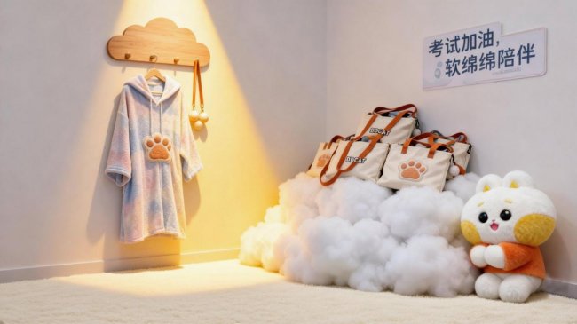 围绕全年不同季节场景需求,系列推出季节限定单品,实现治愈穿搭的全时段覆盖:考试季专属 “逢考必过” 连帽浴巾搭配减压 “捏捏” 帆布袋,帆布袋背带缝制猫爪硅胶球,为备考学子传递好运与慰藉;户外场景专属 UPF50+云朵速干防晒衬衫,搭配猫耳打包渔夫帽,防晒衬衫收纳袋设计为猫形挂饰,实用与萌趣兼具;出行场景的亲子羽绒披毯,展开可作为披风抵御风寒,折叠后变身抱枕,适配飞机、高铁等出行需求,让温暖陪伴全程在线。